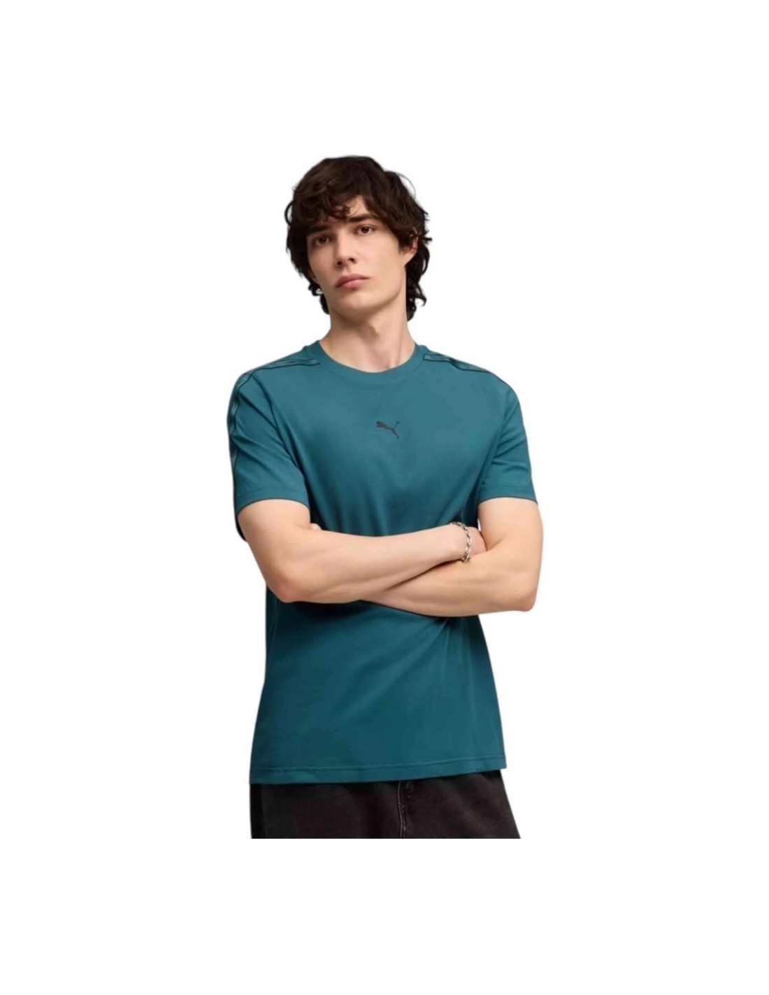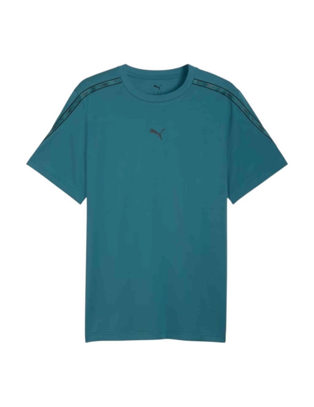 La construcción de la prenda destaca por su confección en un tejido de algodón premium, que garantiza una suavidad superior al tacto y una transpirabilidad óptima durante todo el día. El elemento distintivo de este modelo es la cinta (tape) con el logotipo de PUMA en las mangas, aplicada con materiales de alta resistencia que soportan perfectamente el uso intensivo. El uso de fibras de alta calidad asegura que la camiseta mantenga su estructura original y la intensidad del color Emerald Ice tras múltiples ciclos de lavado.
